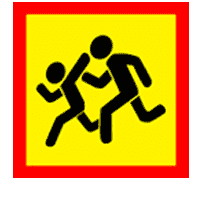 Перевозка детей — в виде квадрата желтого цвета с каймой красного цвета (сторона не менее 250 мм, ширина каймы — 1/10 стороны), с черным изображением символа дорожного знака 1.21 — спереди и сзади автобусов или грузовых автомобилей при перевозке групп детей;