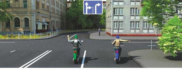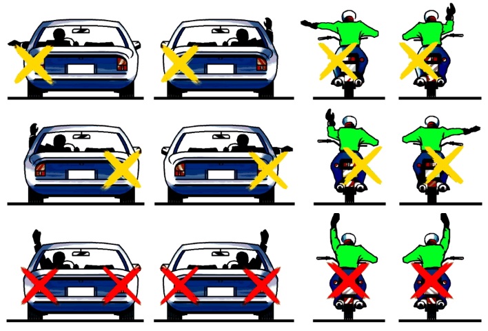 Сигналу левого поворота (разворота) соответствует вытянутая в сторону левая рука либо правая, вытянутая в сторону и согнутая в локте под прямым углом вверх. Сигналу правого поворота соответствует вытянутая в сторону правая рука либо левая, вытянутая в сторону и согнутая в локте под прямым углом вверх. Сигнал торможения подается поднятой вверх левой или правой рукой.