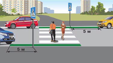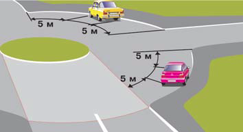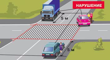 - на пересечении проезжих частей и ближе 5 м от края пересекаемой проезжей части, за исключением стороны напротив бокового проезда трехсторонних пересечений (перекрестков), имеющих сплошную линию разметки или разделительную полосу;