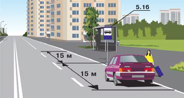 - ближе 15 м от остановочных площадок, а при их отсутствии — от указателя остановки маршрутных транспортных средств или такси, если это создаст помехи их движению;