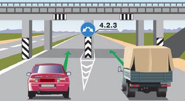 9.10. Водители транспортных средств на дорогах с двусторонним движением (при отсутствии разделительной полосы или островков безопасности) должны объезжать элементы дорожных сооружений, тумбы (опоры мостов, путепроводов и тому подобное), находящиеся на середине проезжей части справа, если дорожные знаки и разметки не предписывают иное.