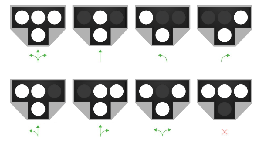 6.8. Для регулирования движения трамваев, а так же других маршрутных транспортных средств, движущихся по выделенной для них полосе могут применяться светофоры одноцветной сигнализации с четырьмя круглыми сигналами бело-лунного цвета, расположенными в виде буквы «Т». Движение разрешается только при включении одновременно нижнего сигнала и одного или нескольких верхних, из которых левый разрешает движение налево, средний — прямо, правый — направо. Если включены только три верхних сигнала, то движение запрещено.