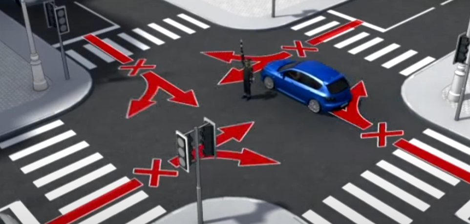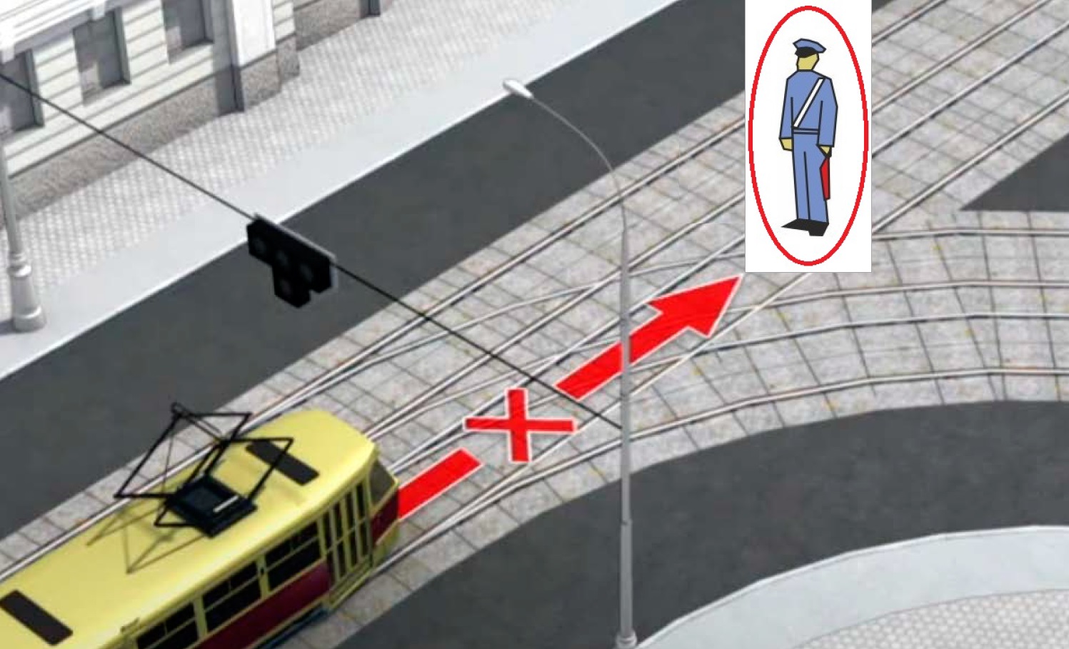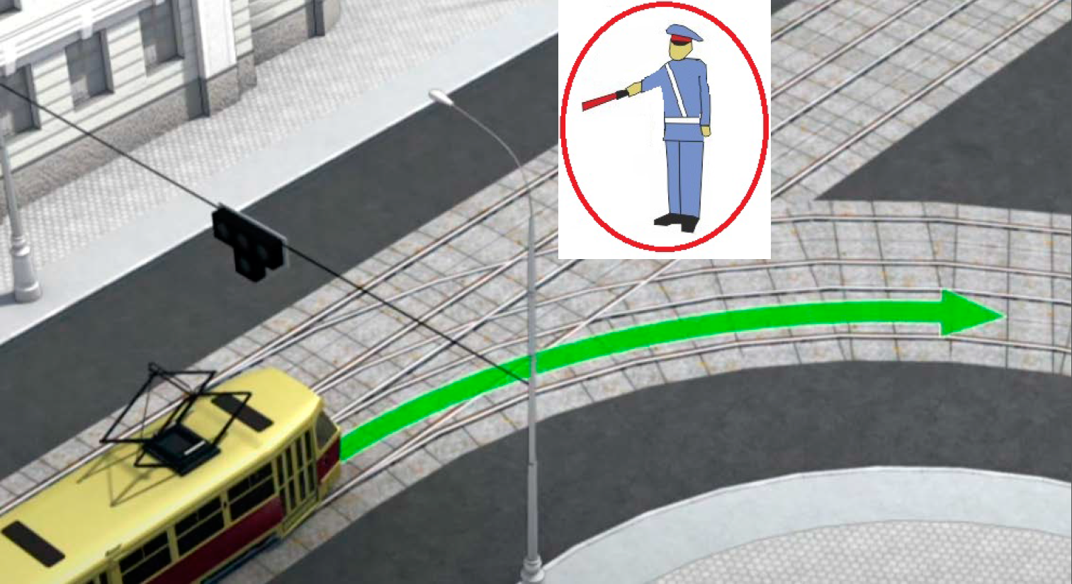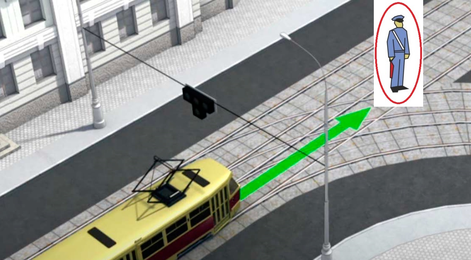 - со стороны левого и правого бока разрешено движение трамваю прямо, безрельсовым транспортным средствам прямо и направо, пешеходам разрешено переходить проезжую часть;