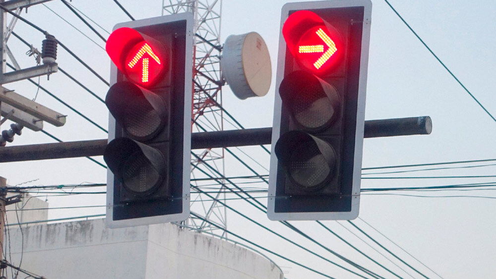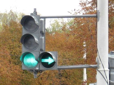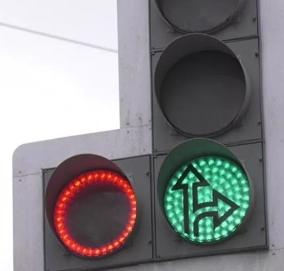 Светофоры с круглыми сигналами могут иметь одну или две дополнительные секции с сигналами в виде зеленой стрелки (стрелок), которые располагаются на уровне зеленого круглого сигнала.