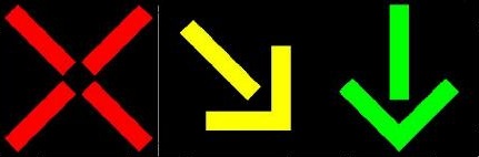 6.7. Для регулирования движения транспортных средств по полосам проезжей части, в частности по тем, направление движения по которым может изменяться на противоположное, применяются реверсивные светофоры с красным Х-образным сигналом и зеленым сигналом в виде стрелы, направленной вниз. Эти сигналы соответственно запрещают или разрешают движение по полосе, над которой они расположены.