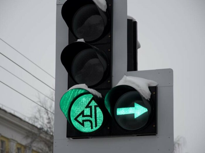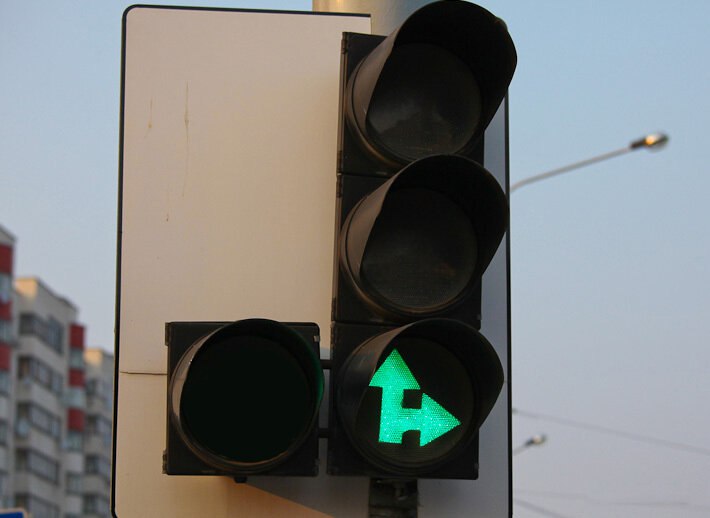 6.3. Сигналы светофора, выполненные в виде стрелок красного, желтого и зеленого цветов(*) , имеют то же значение, что и круглые сигналы соответствующего цвета, но их действие распространяется только на направления (направление), указываемое стрелками. При этом стрелка, разрешающая поворот налево, разрешает и разворот, если это не запрещено соответствующим дорожным знаком.